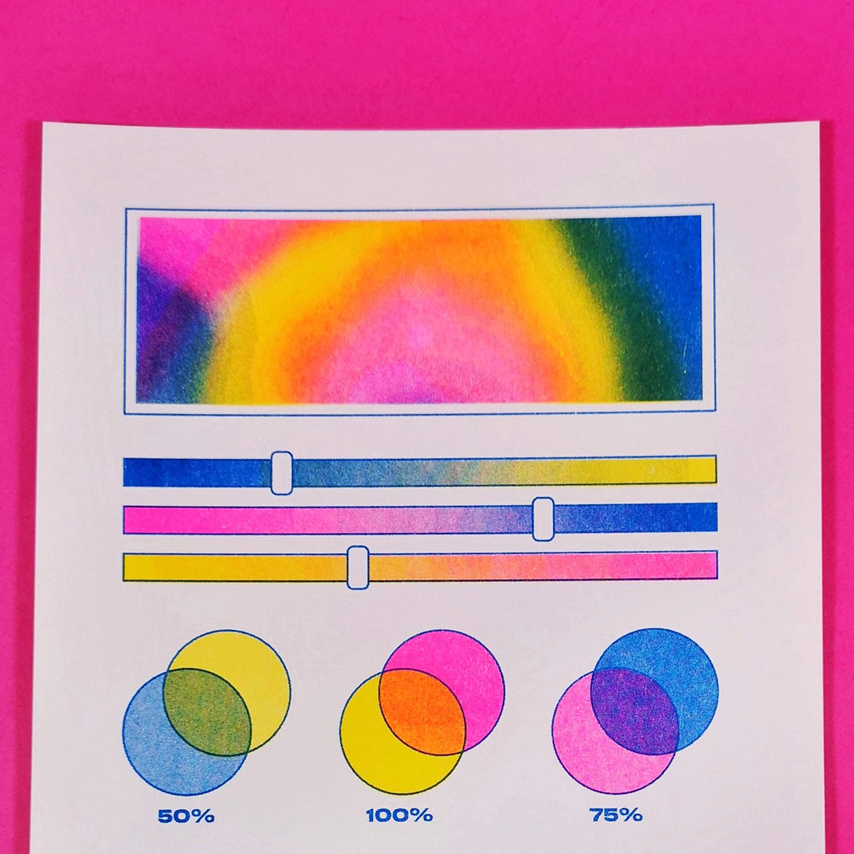 Because Riso inks are not opaque, they will not block the color below if printed over it. It will instead create a new color. By carfully overlaying colors in your file, you can create new tones and fun effects.