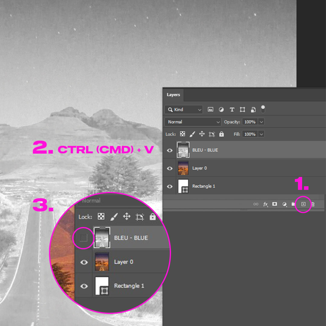 Paste in layers1. Go back to your layers panel and create a new layer. 2. Hit CTRL (or ⌘ Cmd)+ V to paste the channel. Do this for every color channel. 3. *Make sure that once you pasted onto a new color layer you hide it so the channels panel shows only the color channels of your original image.