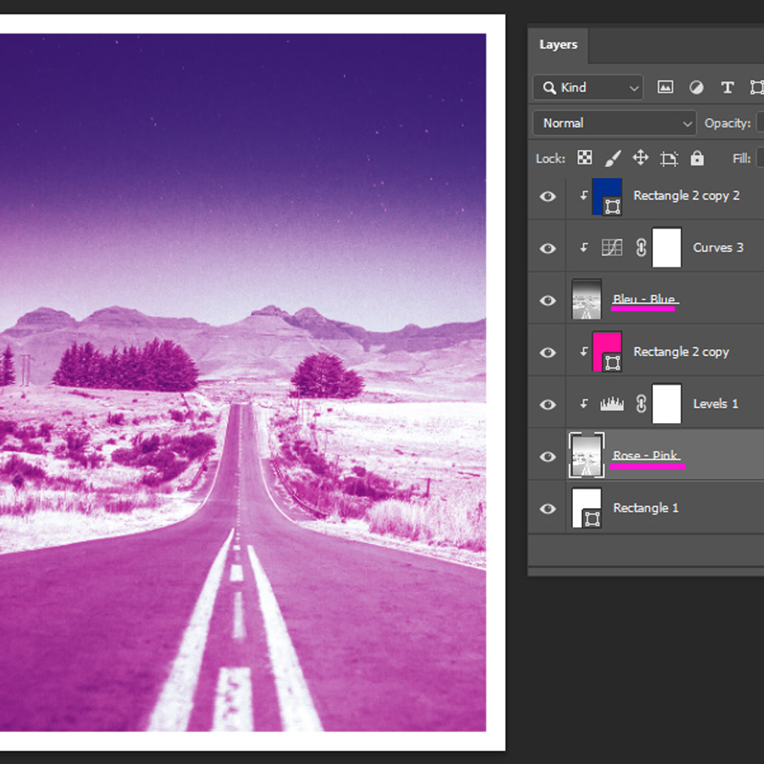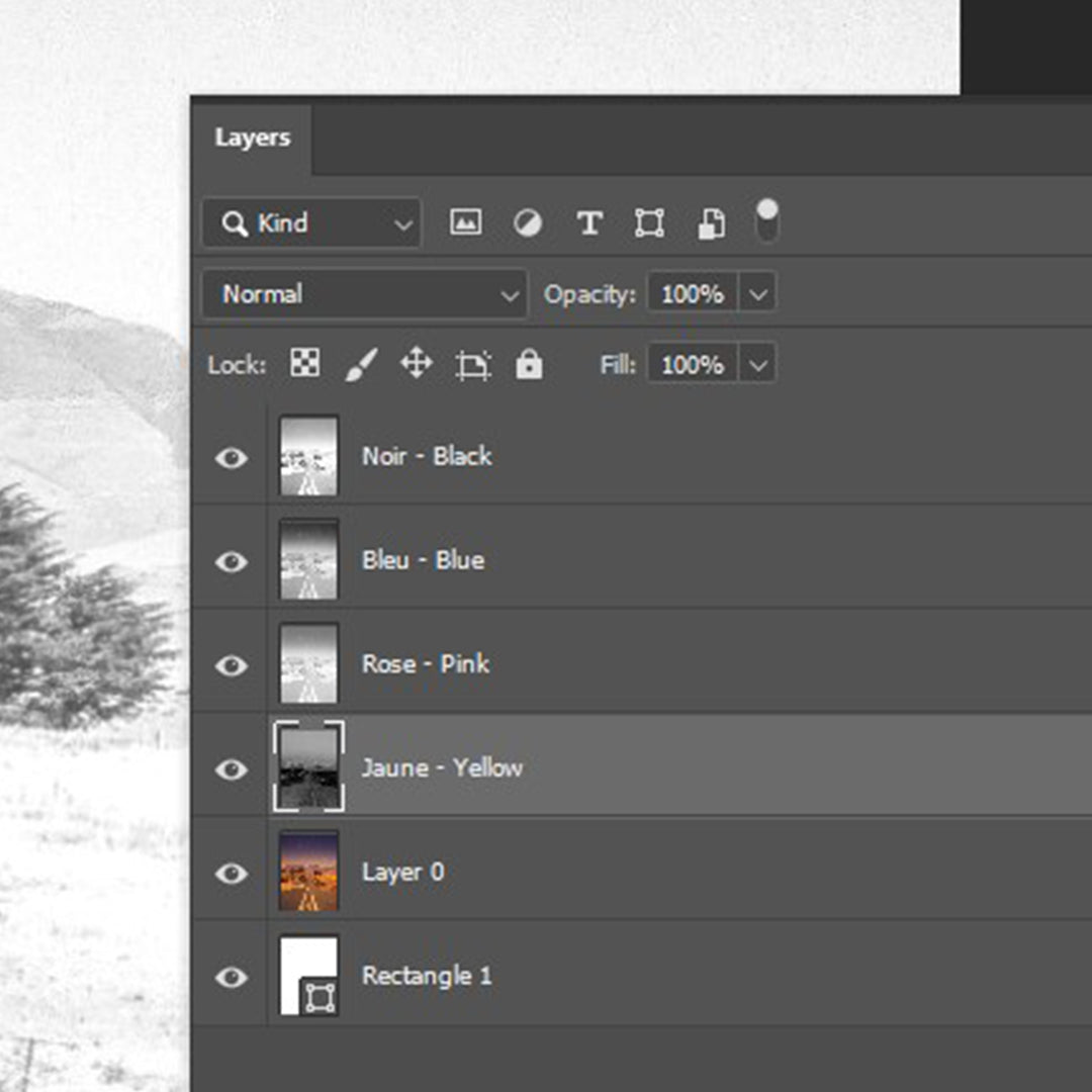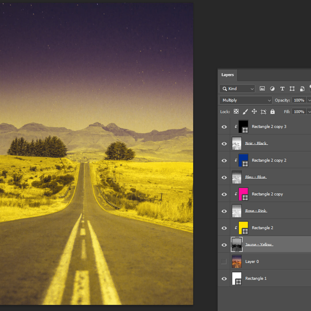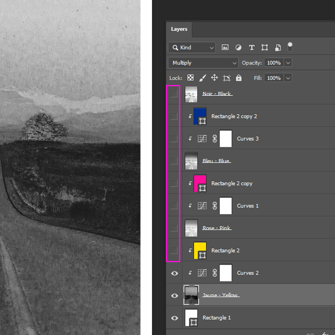 Organize and name layersWe print the lighter colors first. To get an accurate preview on how your colors will overlay, place them in this order, from bottom to top: Yellow, pink, red, blue, black.