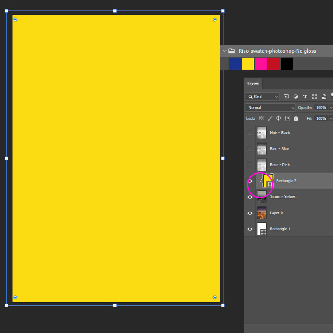 Color previewSee color swatchAn easy way to preview your colors is to apply a fill layer or a rectangle with a clipping mask to your color layer. Apply a color to each layer. Download our Riso color swatch for color accuracy.