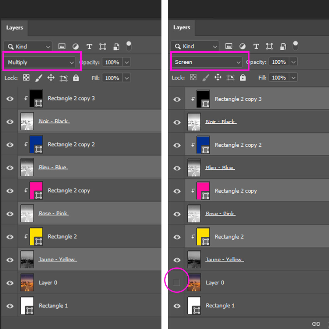 1. Set all color layers to multiply2. Set color fills or rectangles to screen 3. Hide original image