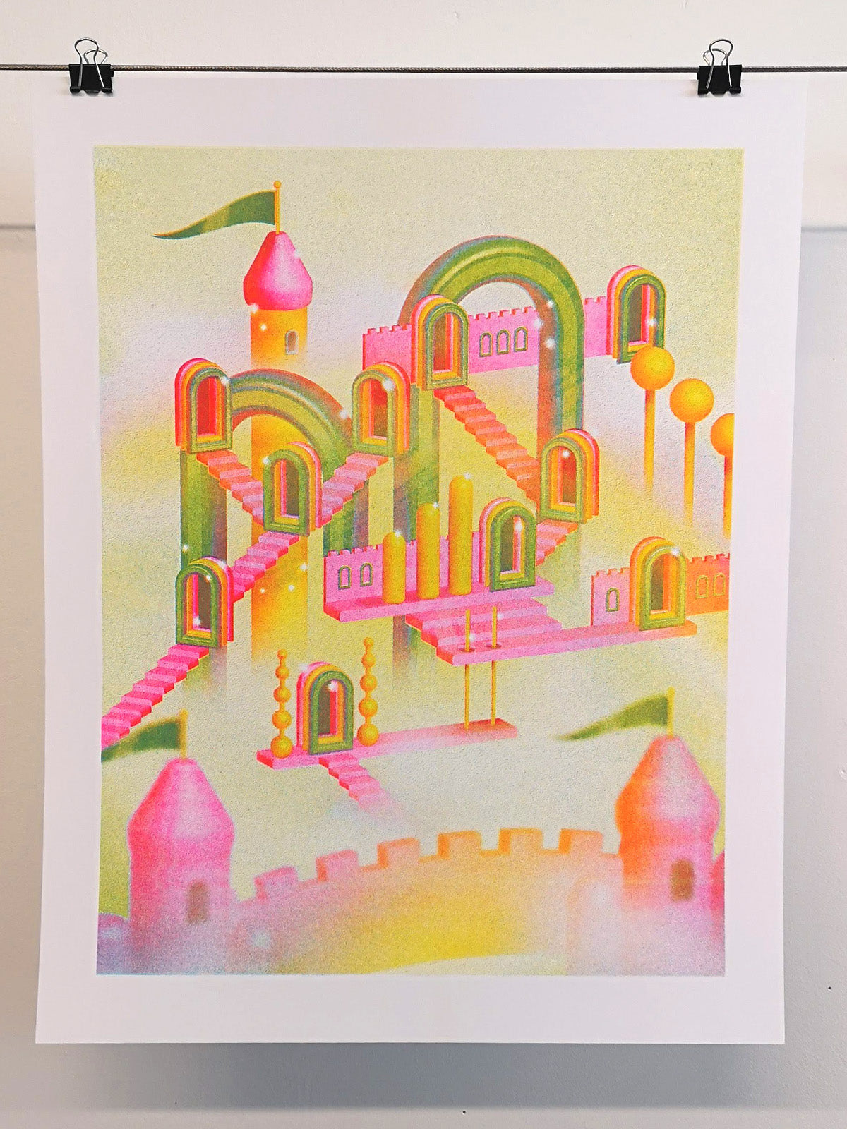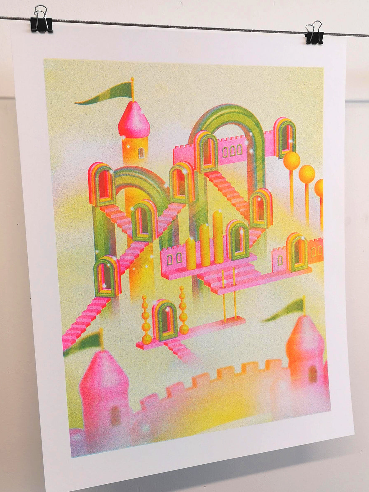 Lo-fi 3D, plastic fantasy art print is oozing with grain! The fluorescent pink and yellow converge to make super bright oranges.