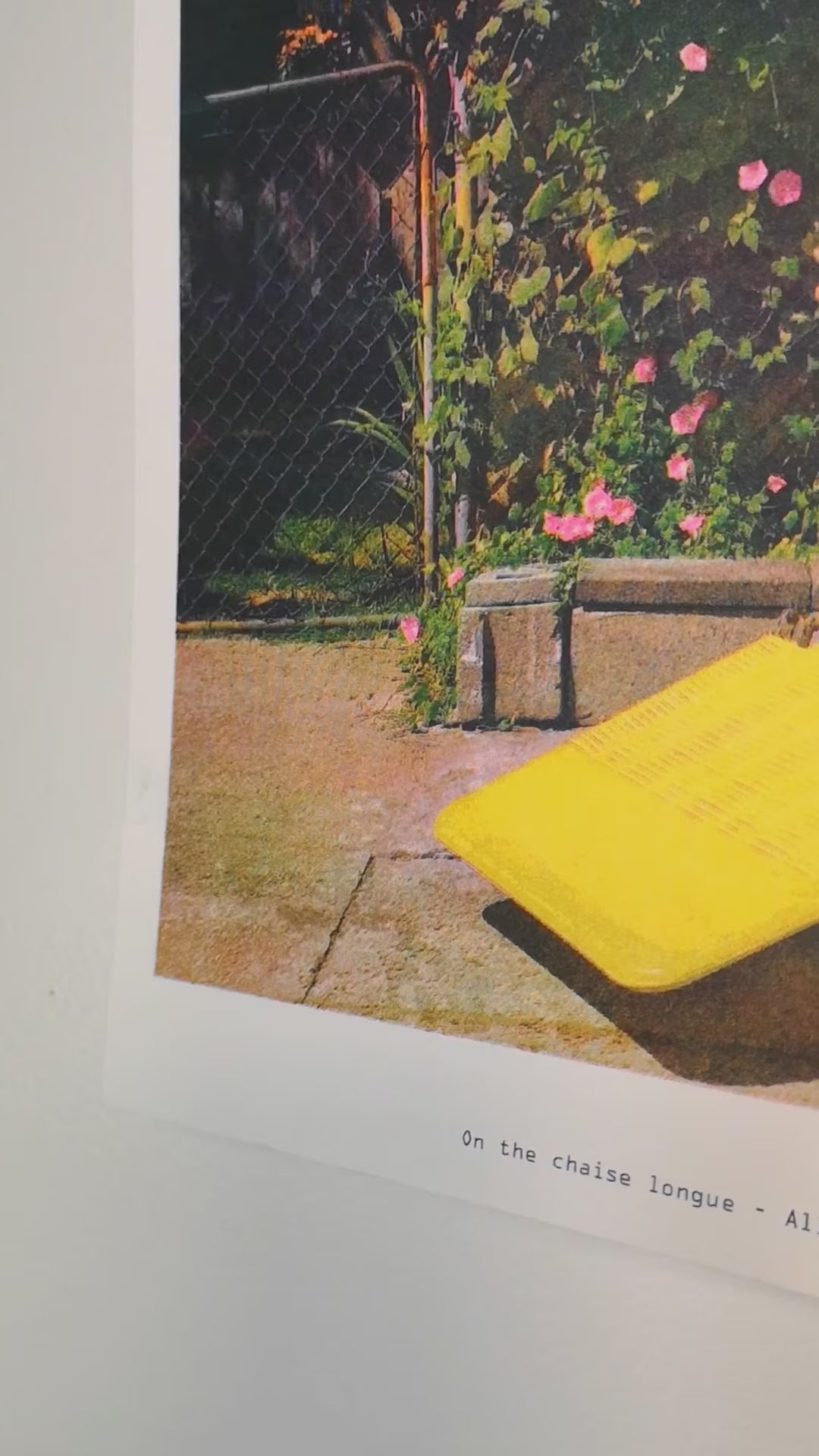 Large riso polaroid photo printed with a very fine screen mech texture. The Riso texture and colors ads the perfect grainy vintage feel. Inspired by Wet Leg's song Chaise Longue.