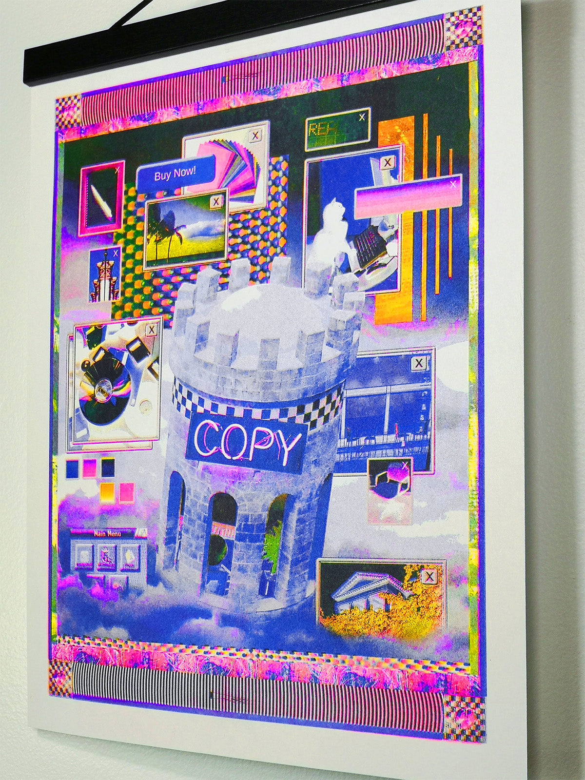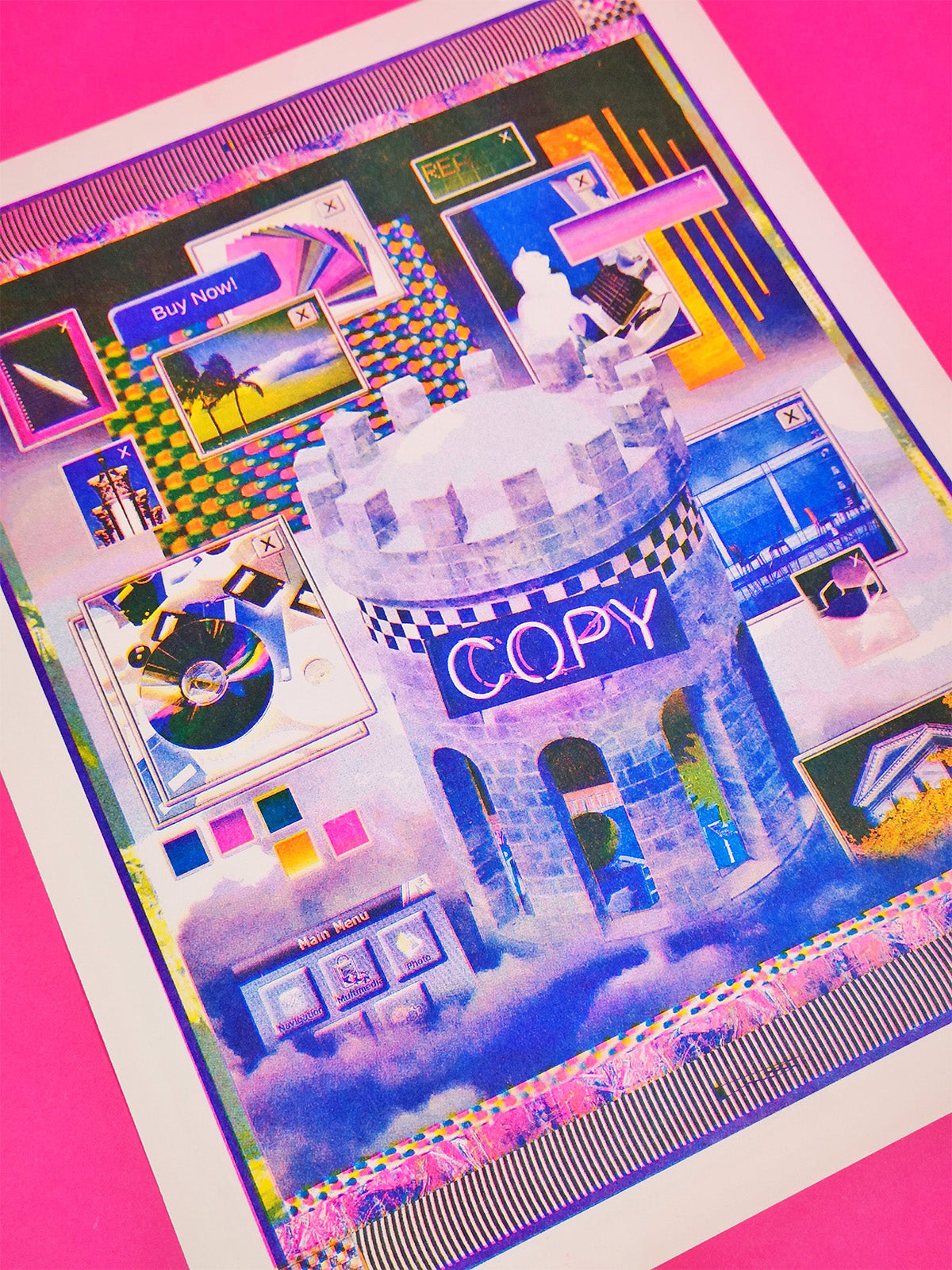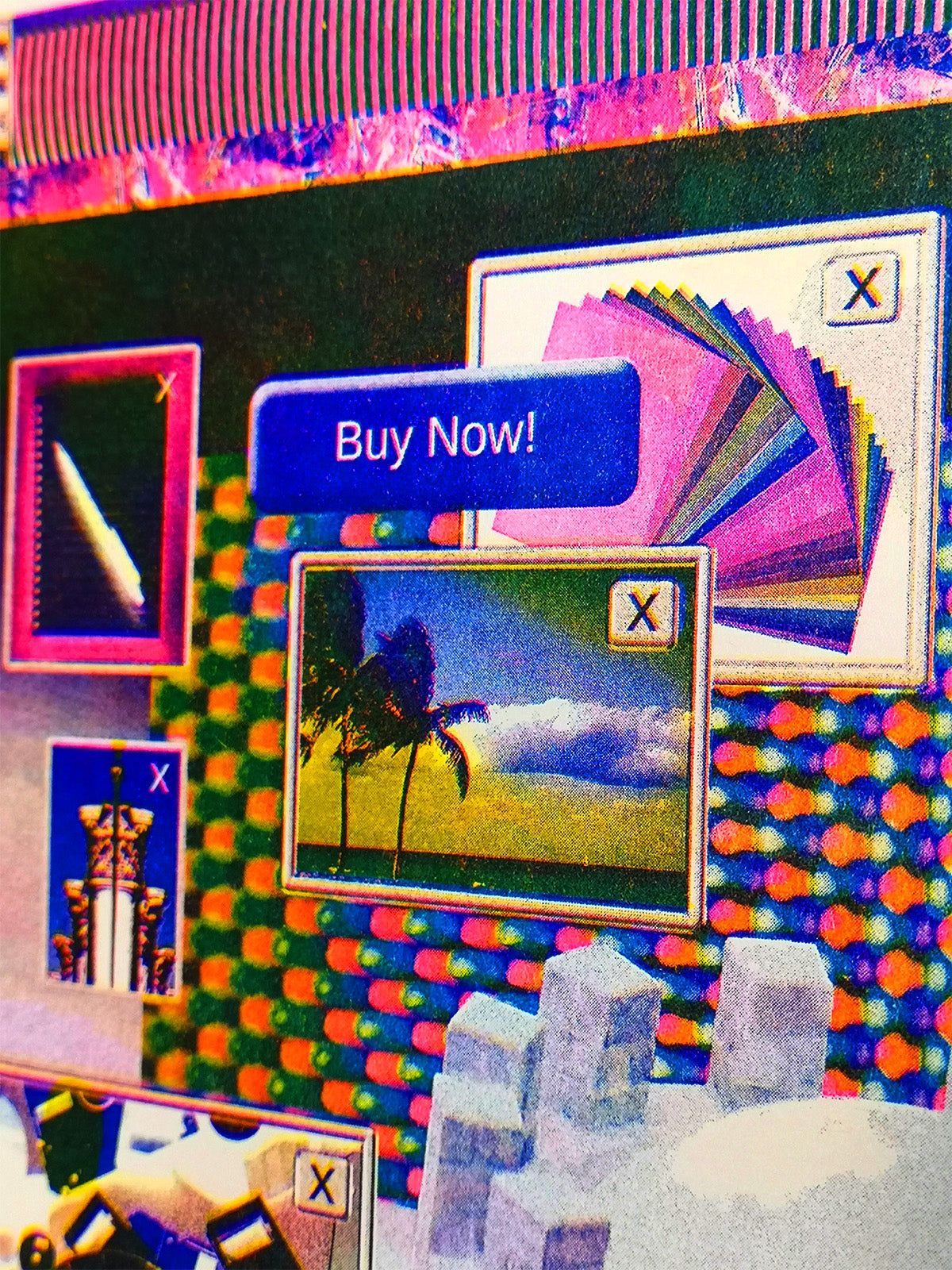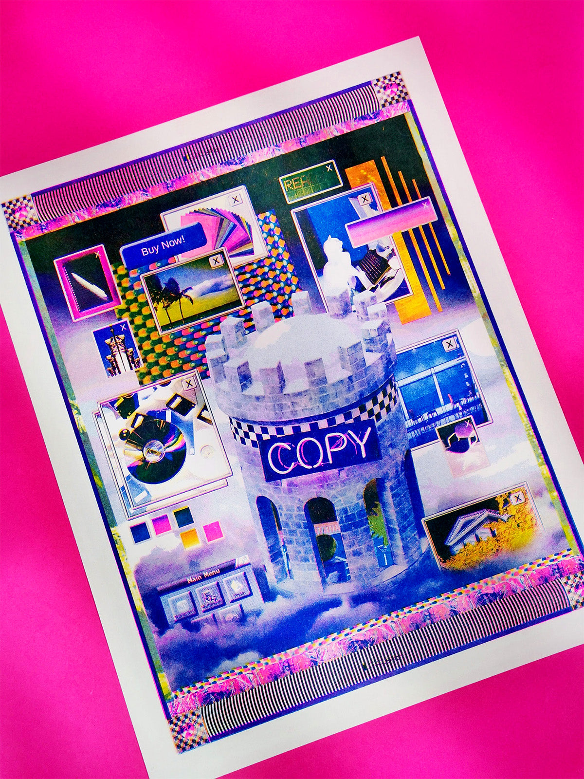 This digital collage is strait out of a vaporwave dream. It depicts boring mundane office life but deep fried. I created this while creating my dream copy shop. This is part one of a two piece collection. Get the set of two for 40$. See pricing option below.